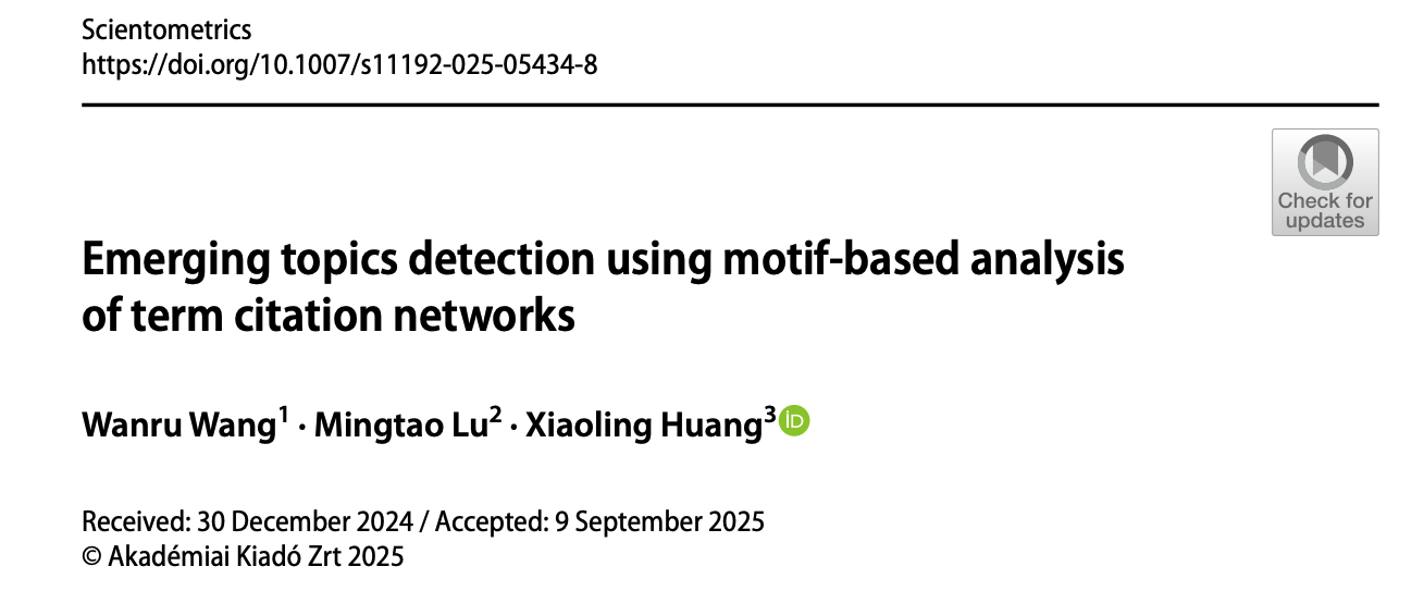 2025年10月,管理科学与工程硕士研究生卢明涛与我院数智决策研究中心王婉茹老师、我校图书馆黄小玲老师合作完成的论文“Emerging topics detection using motif-based analysis of term citation networks”在国际期刊Scientometrics在线发表。Scientometrics是一本专注于信息计量学与科学计量学的国际学术期刊,2025年影响因子为3.5,属于信息资源管理领域JCR一区、FMS-B类期刊。该论文的工作受到了国家自然科学基金青年项目的支持。