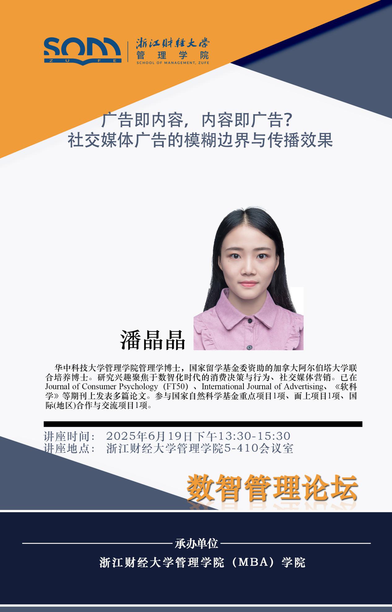 伟德国际1946新财经战略系列学术活动2025年第47期【学术报告】潘晶晶:广告即内容,内容即广告?社交媒体广告的模糊边界与传播效果