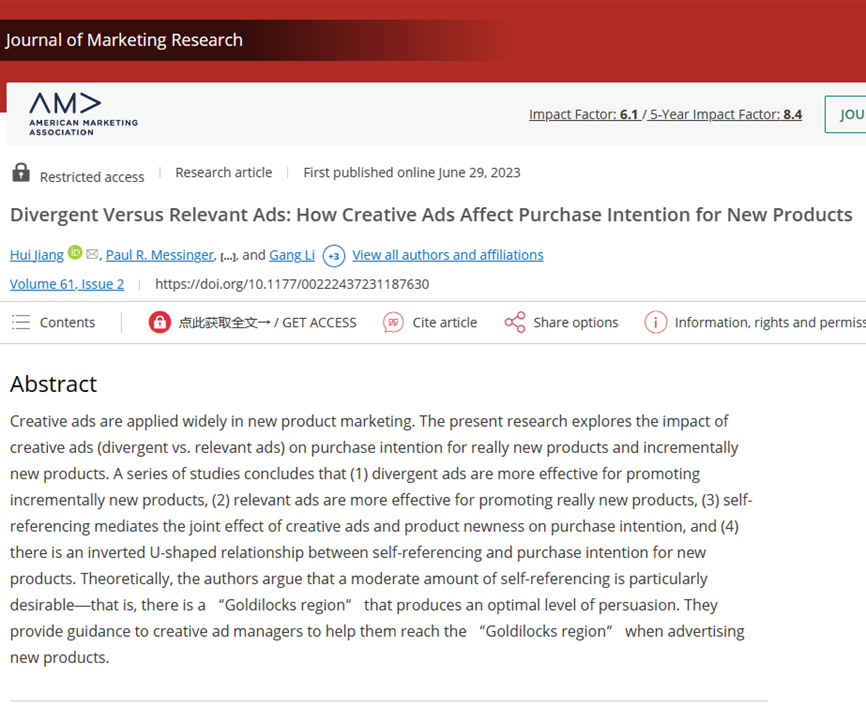 伟德国际1946杨水清副教授作为通讯作者,撰写的“Divergent Versus Relevant Ads: How Creative Ads Affect Purchase Intention for New Products”(发散型vs.关联型:创意广告如何影响新产品购买意愿)被市场营销类国际顶级期刊 Journal of Marketing Research 录用并发表。