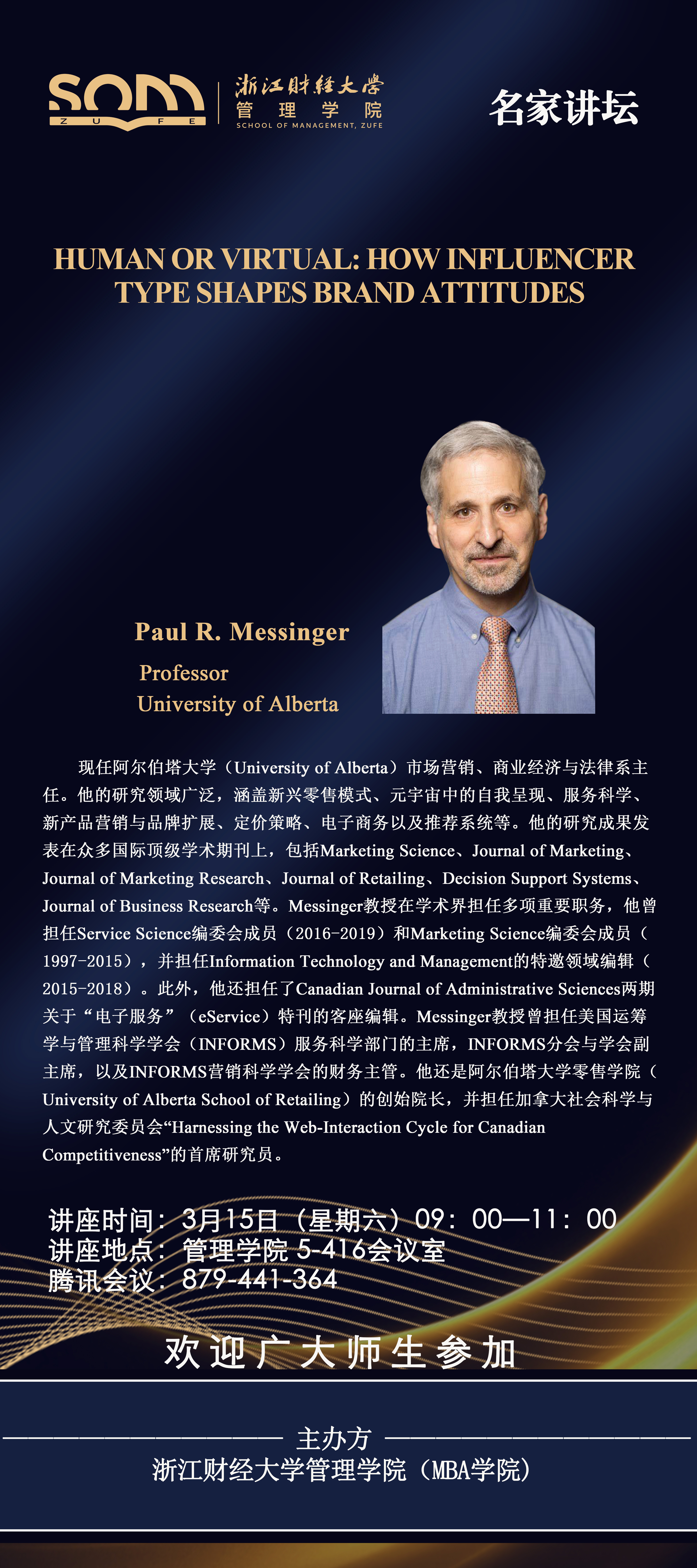 伟德国际1946新财经战略系列学术活动2025年第10期【名家讲坛】Paul R. Messinger:Human or virtual: How influencer type shapes brand attitudes