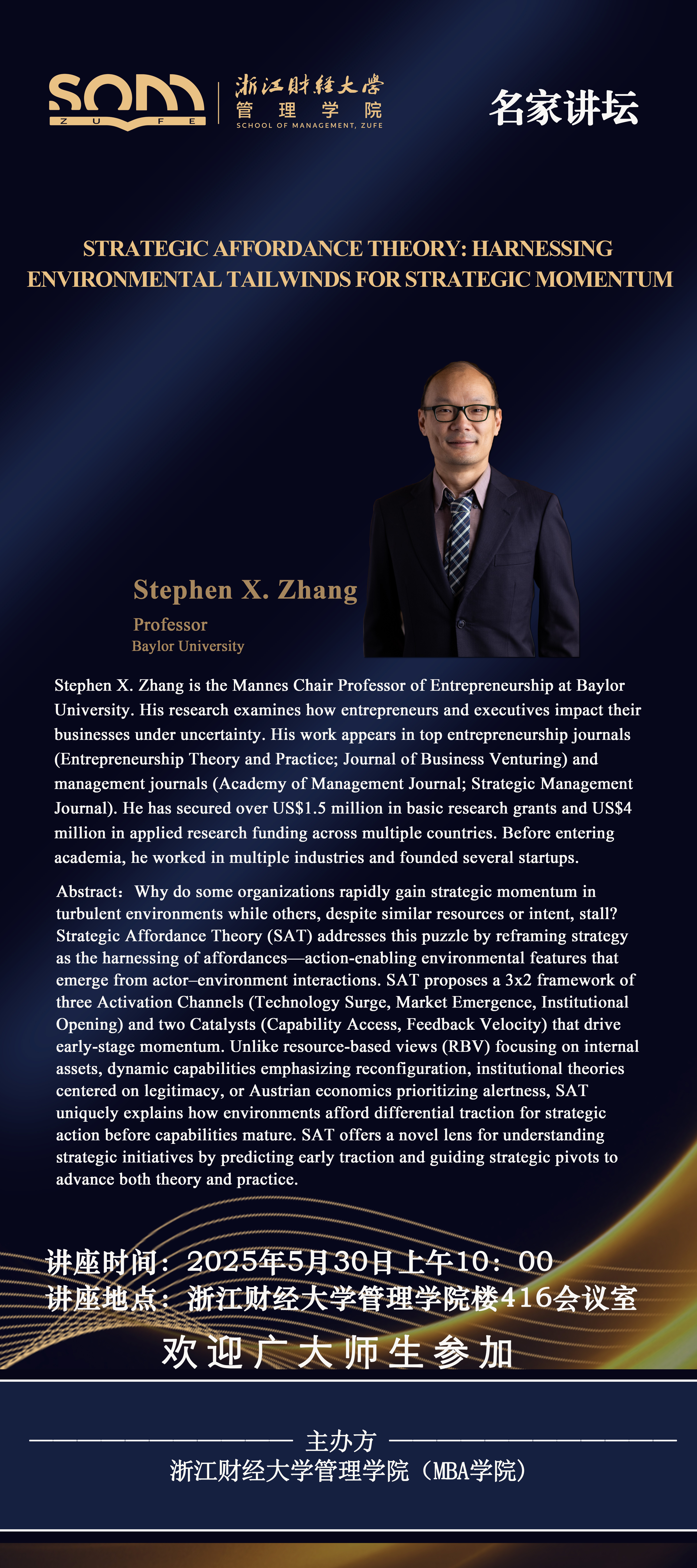 伟德国际1946新财经战略系列学术活动2025年第41期【名家讲坛】Stephen X. Zhang:Strategic Affordance Theory :Harnessing Environmental Tailwinds for Strategic Momentum