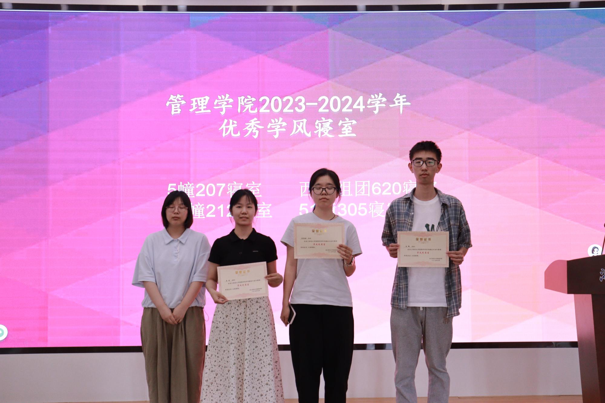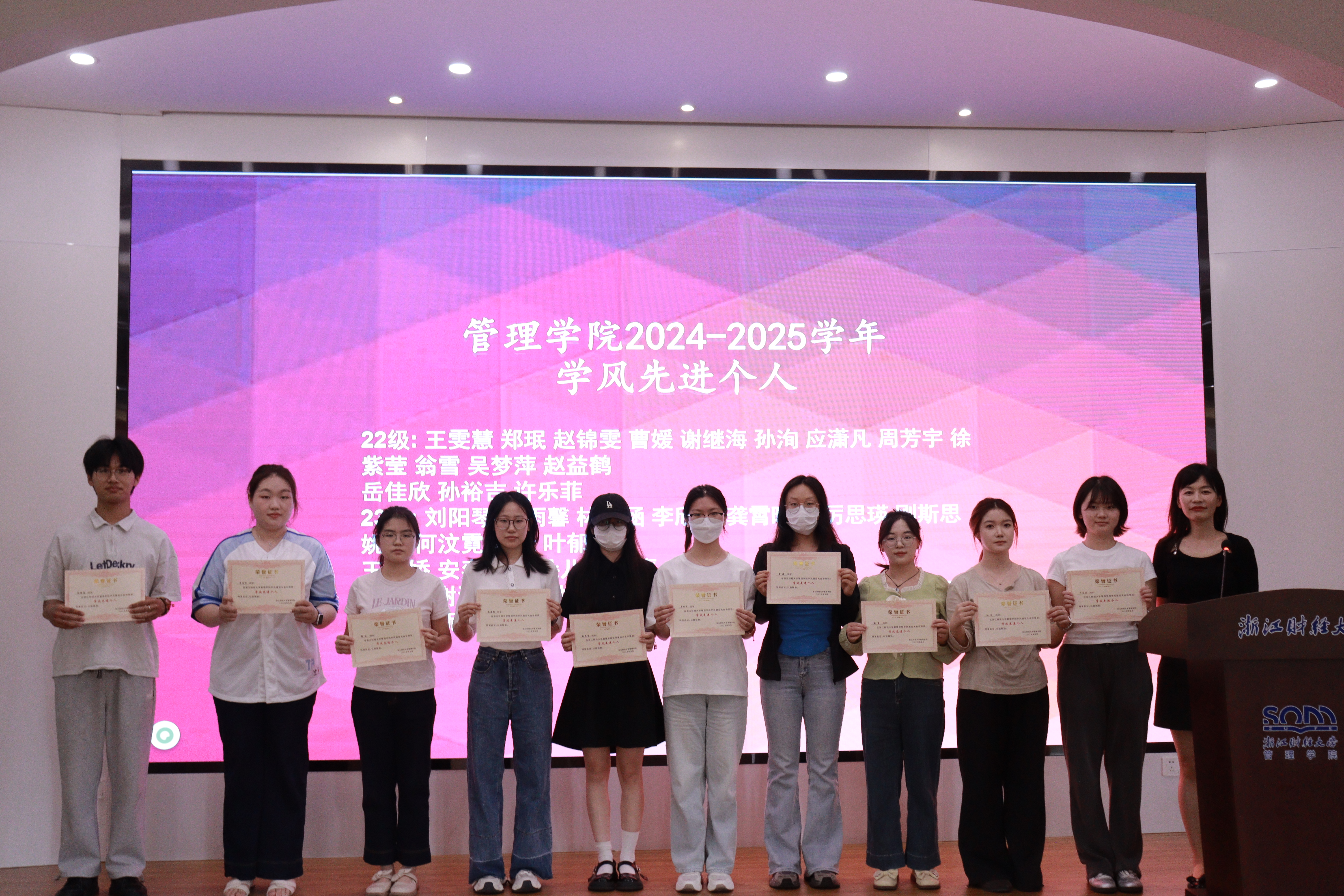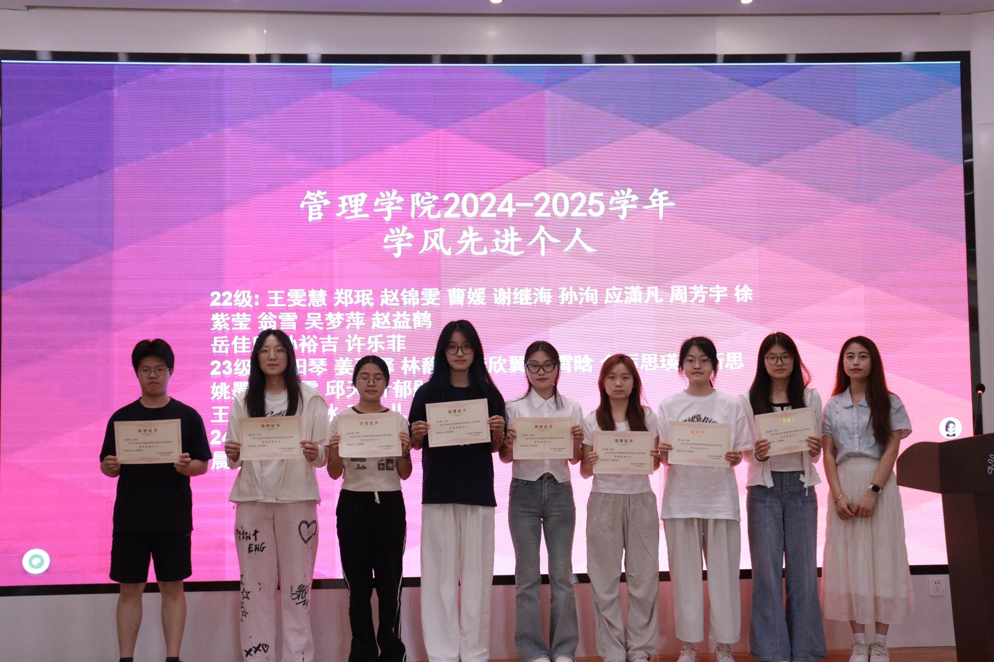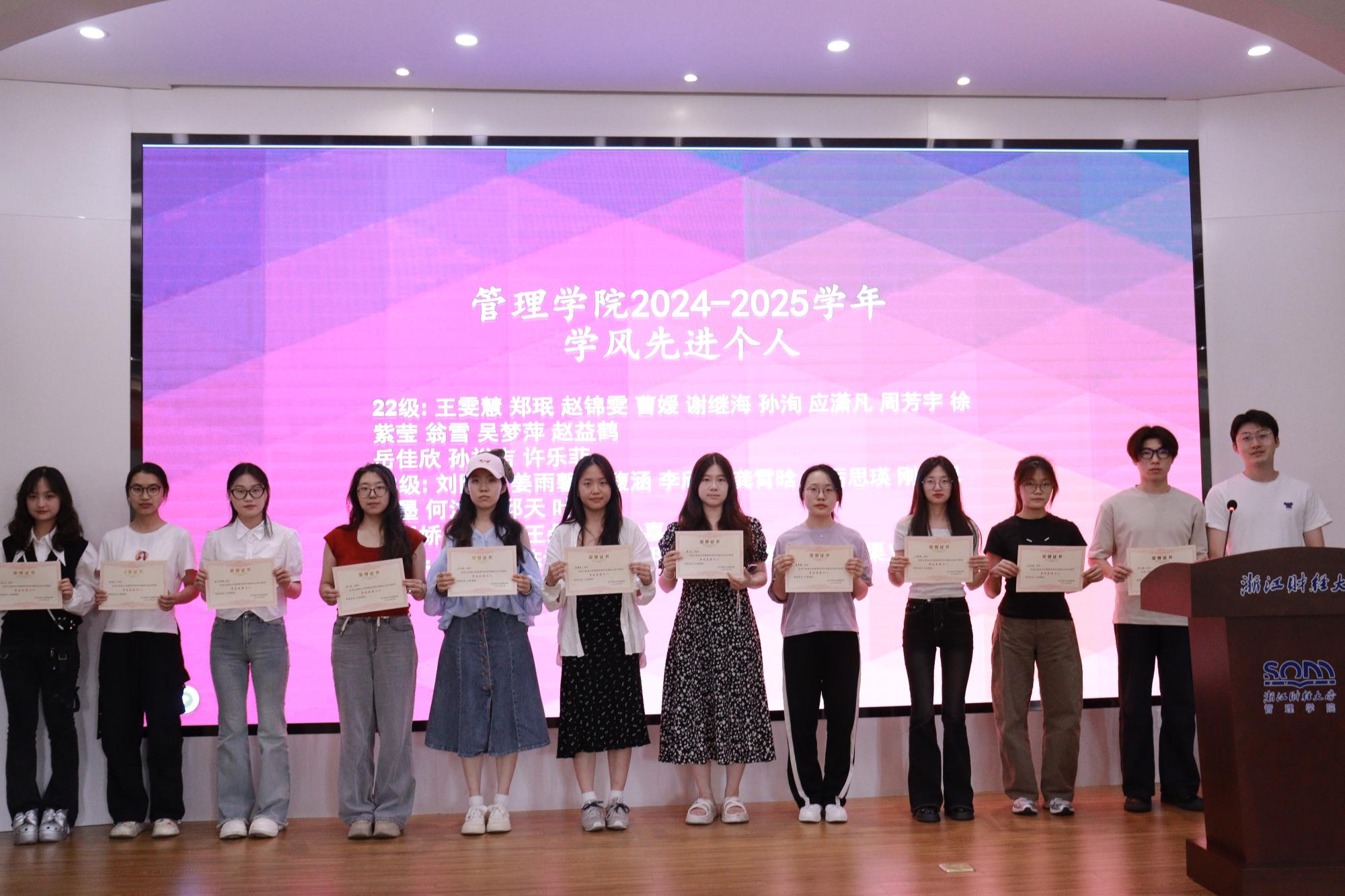 会议对2024-2025学年22、23、24级学风先进个人进行表彰,学院领导和辅导员为获奖学生颁发奖状。会上,优秀学风寝室也受到表彰,寝室代表分享了共同学习、互相监督的经验,如制定作息表、共享学习笔记、集体参与模拟面试等,展现了集体进步的力量。