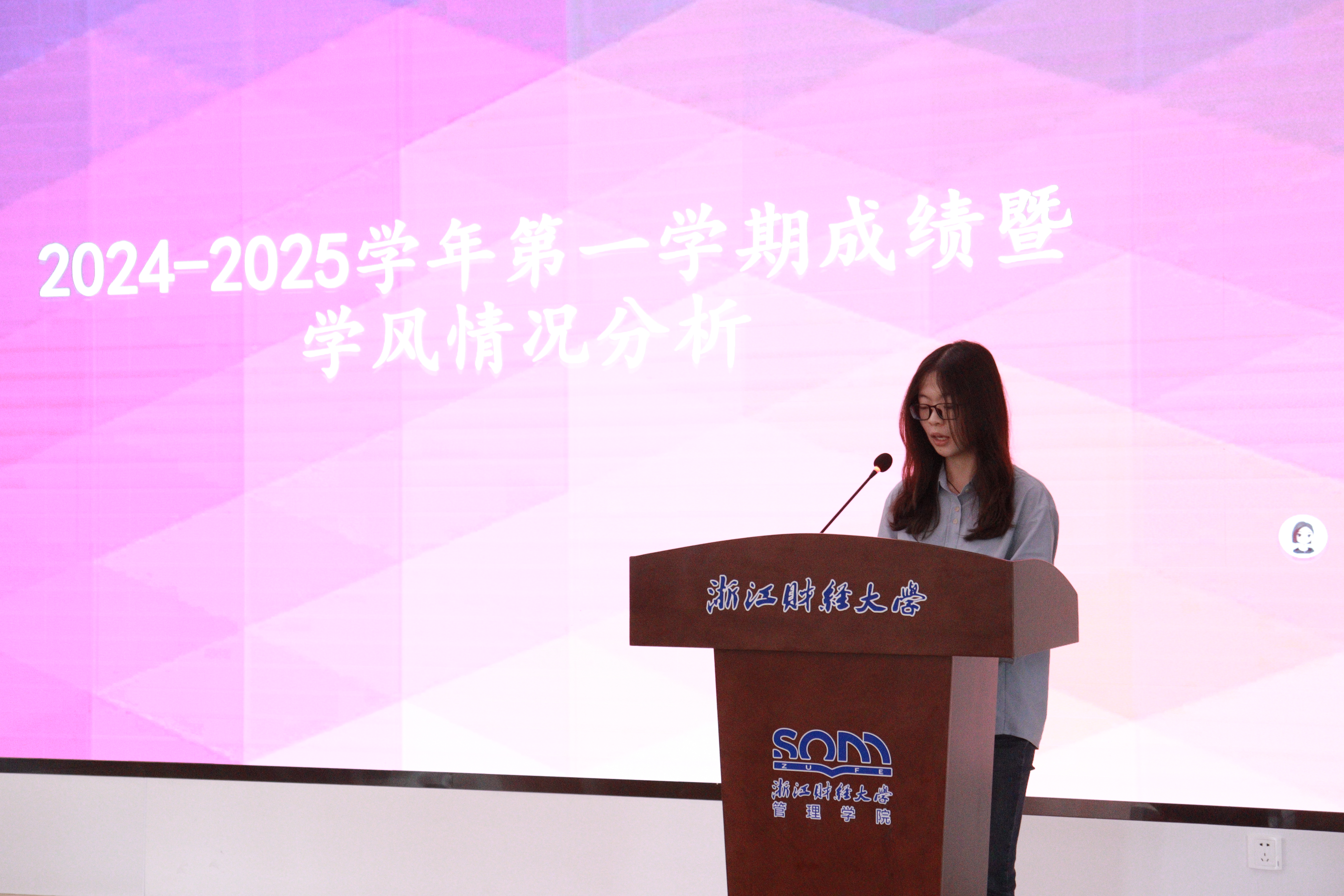 随后,主持人介绍了学风先进个人的优秀事迹,学风先进个人代表王朵儿分享学习经验,从时间管理、学习方法等方面进行详细阐述,为同学们提供借鉴。学院学习部负责人姜雨馨作学风情况报告,通过分析三个年级各班学习情况和成绩数据,指出本学年整体学风良好,课堂抬头率提高、晨读活动参与度提升、学科竞赛获奖增多。她鼓励同学们持续参与晨读活动,进一步浓厚学术氛围。